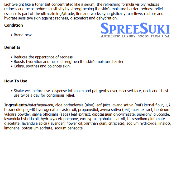 Lightweight like a toner but concentrated like a serum, the refreshing formula visibly reduces redness and helps reduce sensitivity by strengthening the skin’s moisture barrier. redness relief essence is part of the ultracalming@trade; line and works synergistically to relieve, restore and hydrate sensitive skin against redness, discomfort and dehydration.